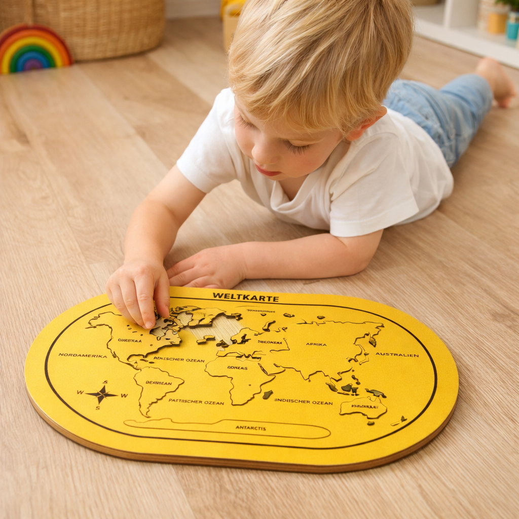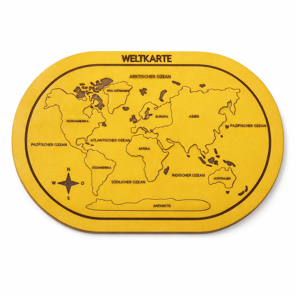 Kinder Puzzle Weltkarte aus MDF 30x21 cm – Lernspiel Holz Kontinente Gelb