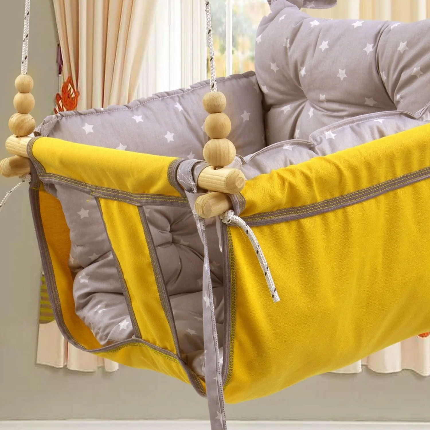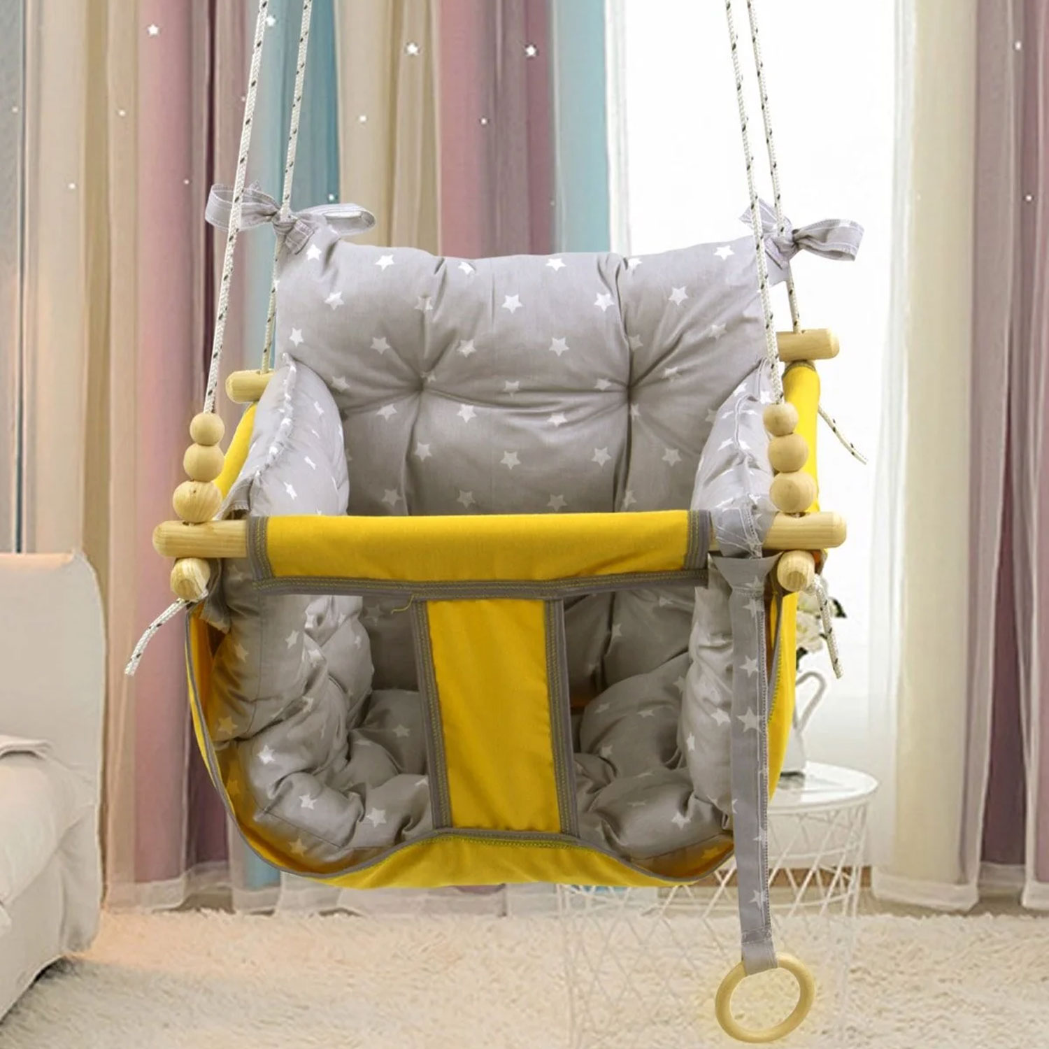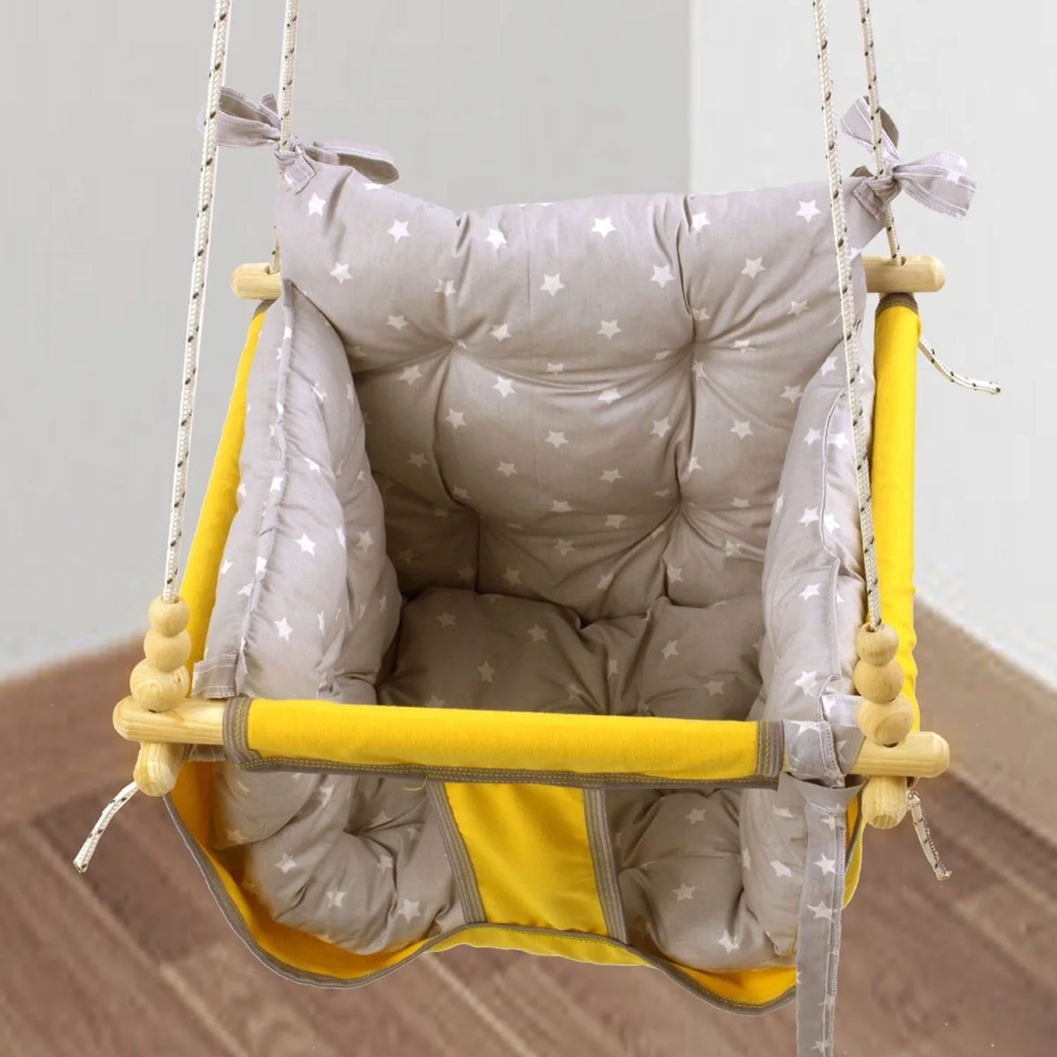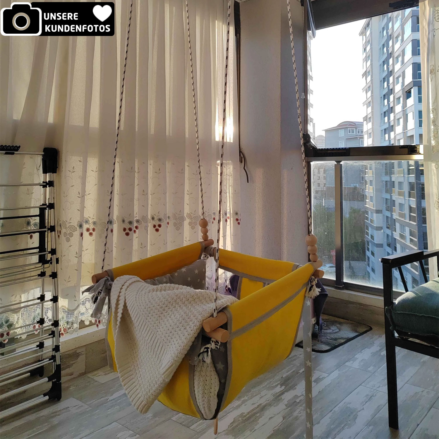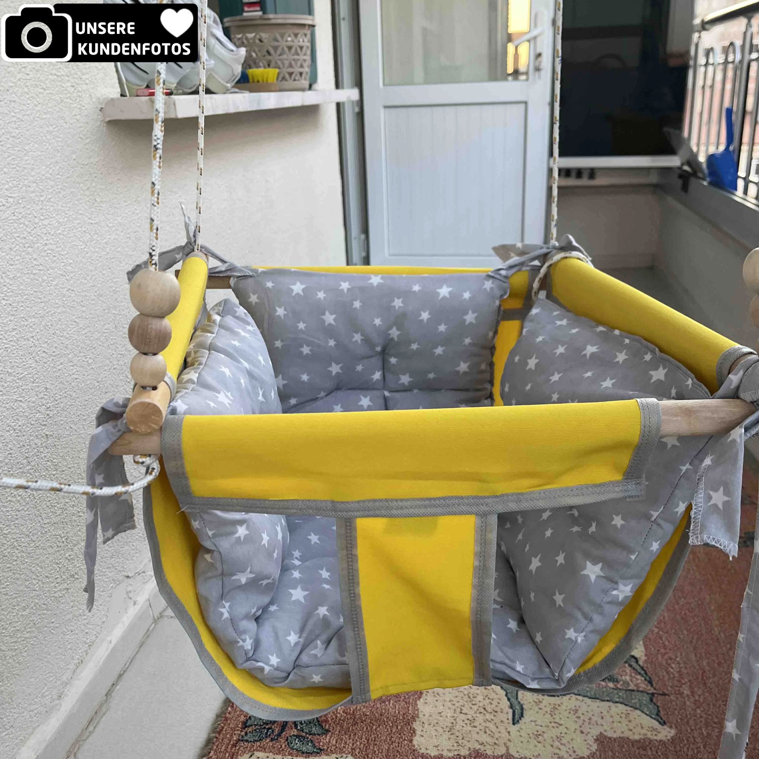 Die Jungengel Baby- & Kinderhängeschaukel bietet sicheren und sanften Schaukelspaß für Babys und Kinder – ideal für Zuhause, Balkon, Terrasse oder Garten. Die rundum geschlossene Stoffkonstruktion sorgt dafür, dass Ihr Kind stabil und geschützt sitzt, während die extra weichen Polster aus 100 % Baumwolle höchsten Komfort garantieren.