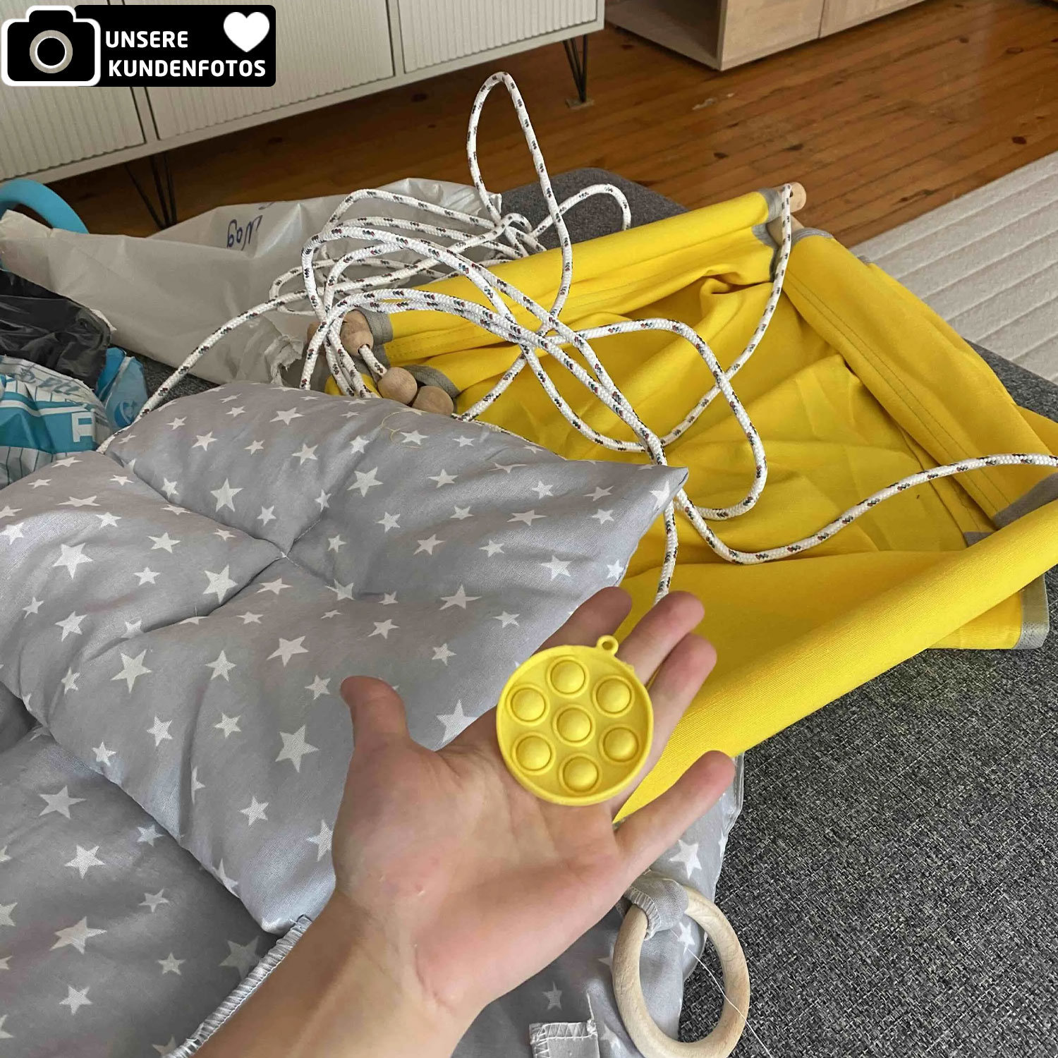 Mit einer Tragkraft von bis zu 60 kg ist diese Hängeschaukel ein langlebiger Begleiter – geeignet ab ca. 6 Monaten bis etwa 7 Jahre.