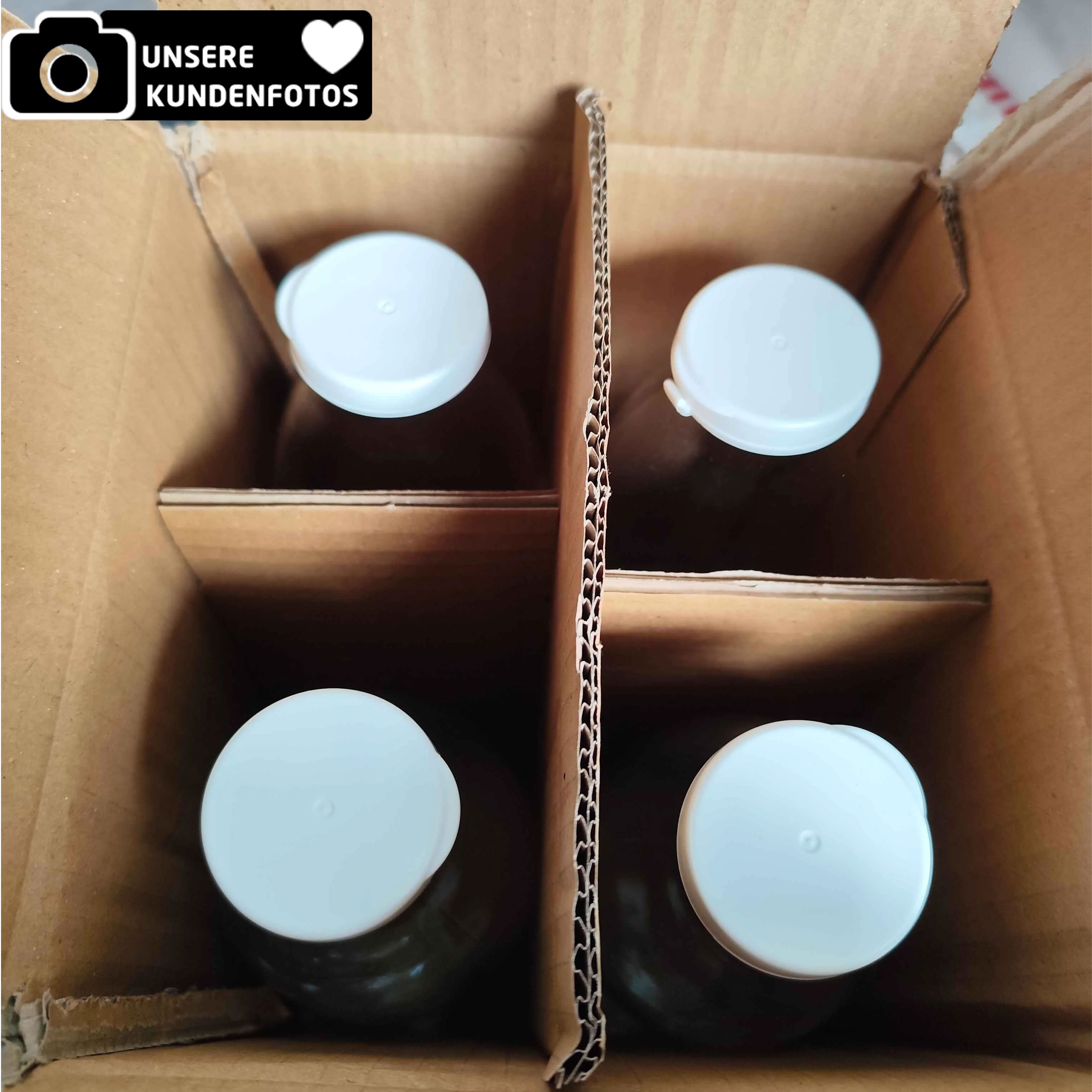 Im Lieferumfang enthalten sind ausschließlich die vier Glasflaschen mit weißen Schraubdeckeln. Auf den Produktbildern dargestellte Getränke, Früchte oder Dekorationsartikel dienen lediglich der Veranschaulichung und sind nicht Bestandteil des Angebots.
