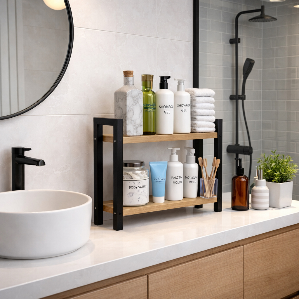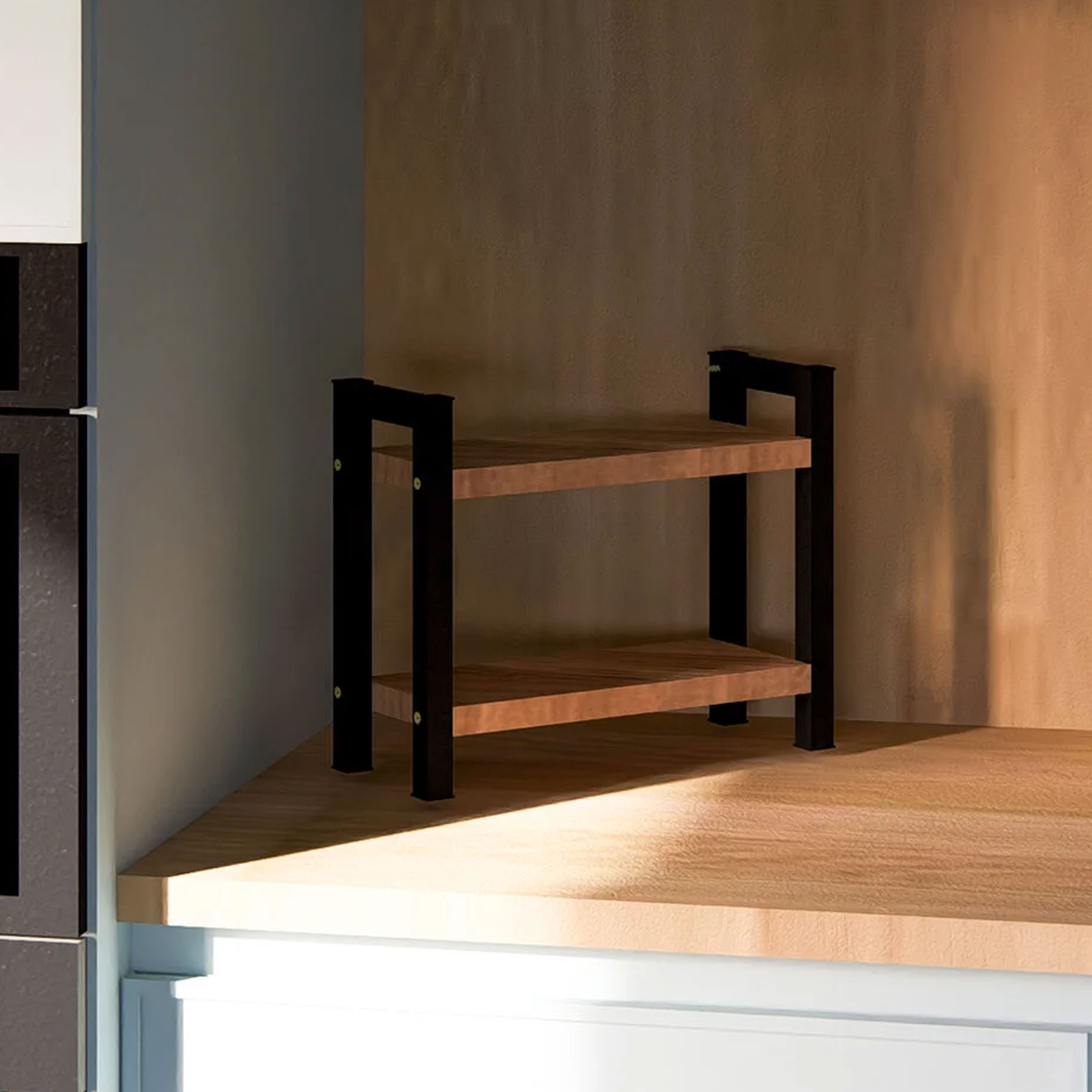 Dieser 2-stufige Küchen- und Bad-Organizer bietet eine praktische und zugleich stilvolle Lösung zur Organisation von Arbeitsflächen, Schränken oder Regalen. Durch die Kombination aus schwarzem Metallrahmen und Regalböden in natürlicher Holzoptik entsteht ein modernes, zeitloses Design, das sich harmonisch in unterschiedliche Einrichtungsstile integrieren lässt – von modern über industriell bis klassisch.
