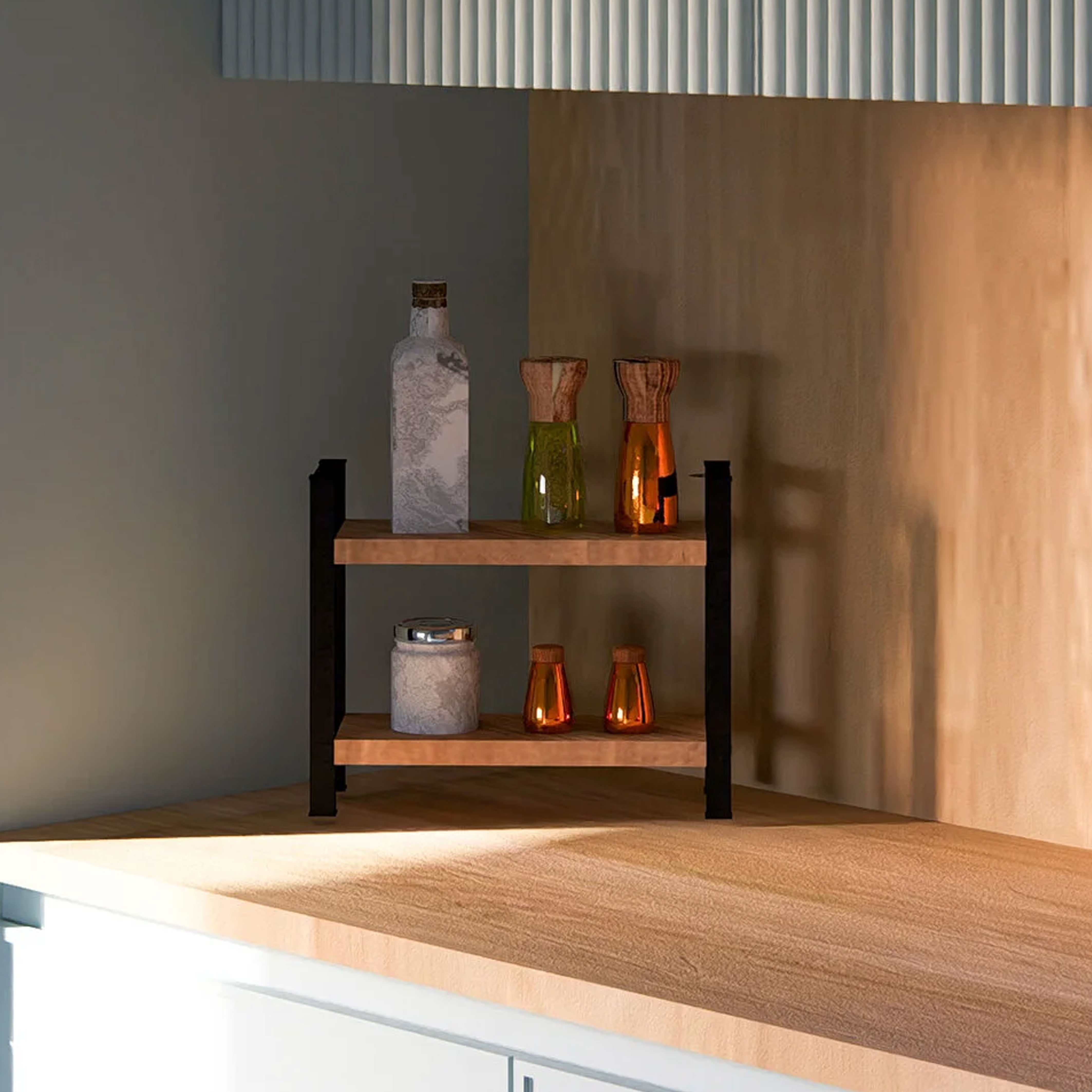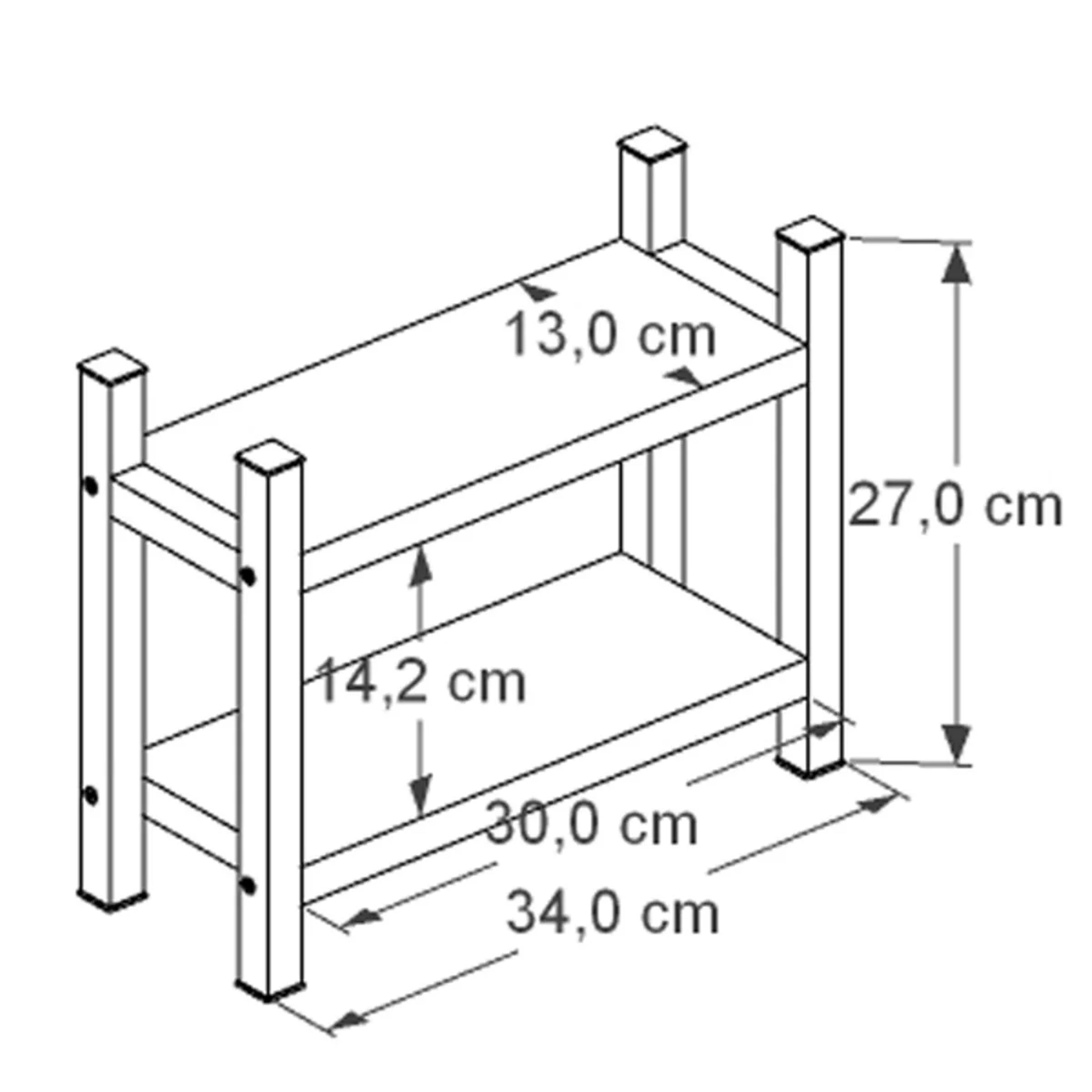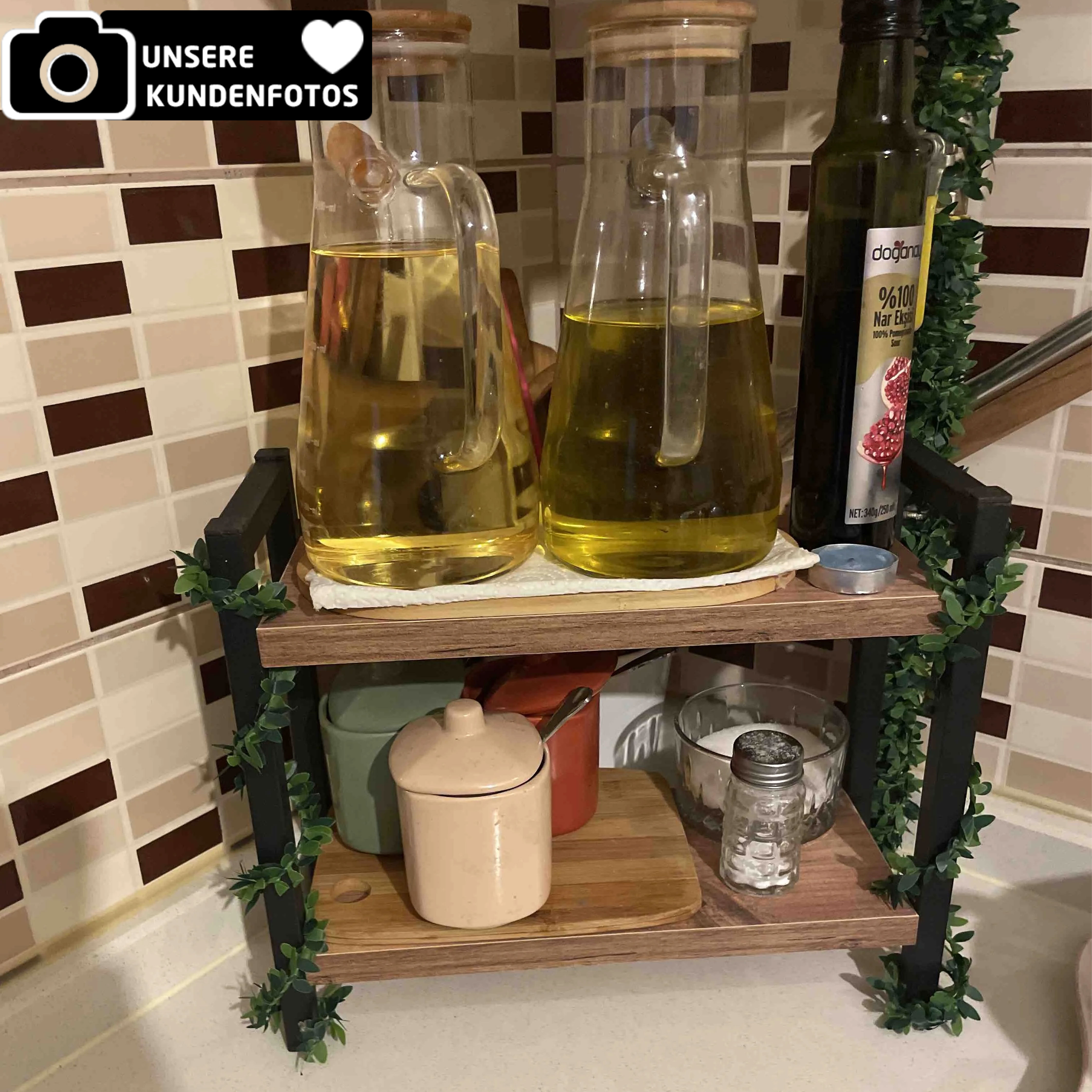 Mit einer Breite von 34 cm, einer Tiefe von 13 cm und einer Höhe von 27 cm eignet sich der Organizer ideal für schmale Nischen oder kompakte Arbeitsbereiche. Der Abstand zwischen den beiden Ebenen beträgt ca. 14,5 cm und bietet ausreichend Platz für Gewürzgläser, Ölflaschen, Vorratsbehälter, Kaffeezubehör oder Pflegeprodukte. Durch die zweistufige Bauweise wird vorhandener Raum effizient genutzt und zusätzlicher Stauraum geschaffen, ohne dabei viel Platz auf der Arbeitsfläche einzunehmen.