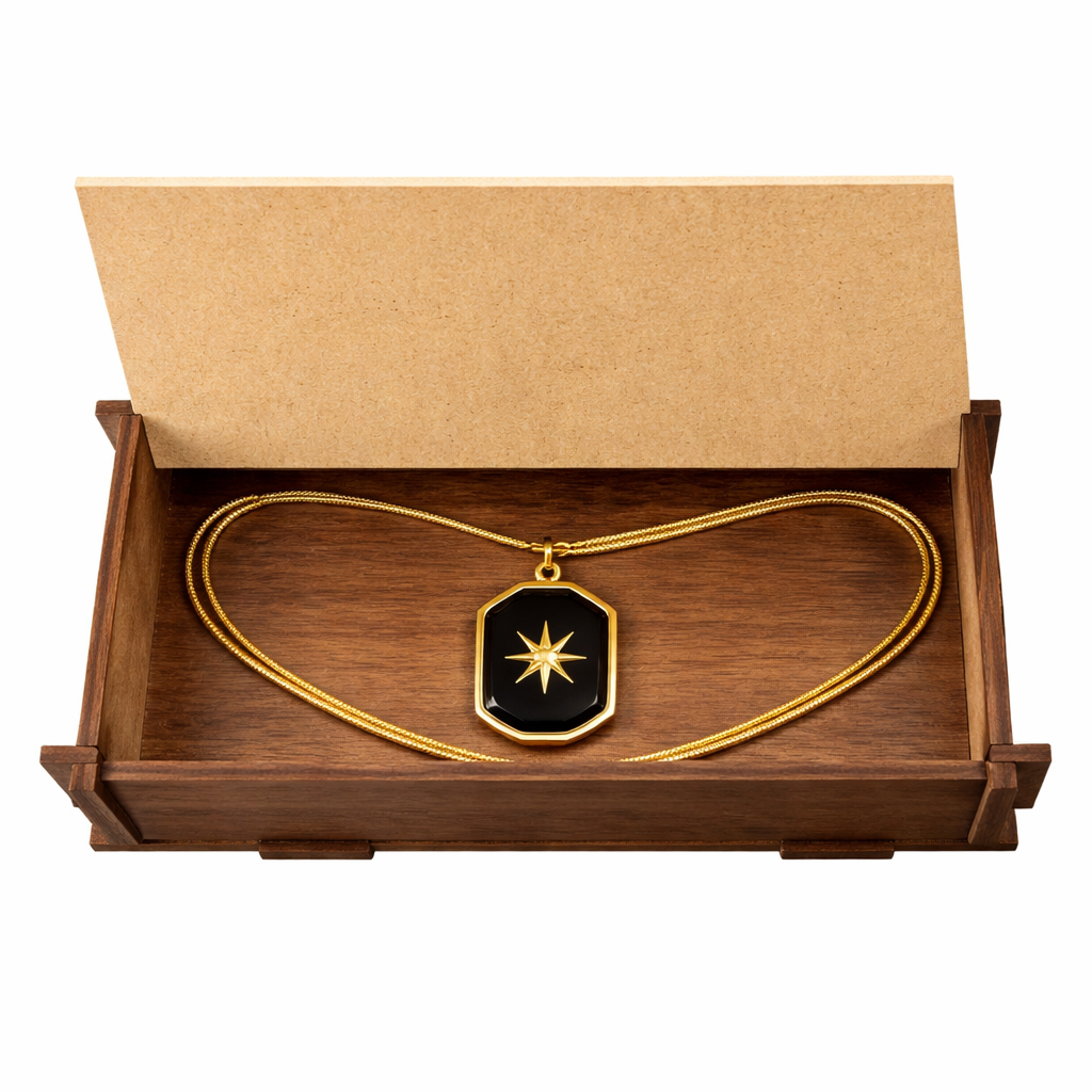 Diese elegante Damenkette mit stilvollem Nordstern-Anhänger vereint modernes Design mit zeitloser Symbolik. Der markante Anhänger zeigt einen fein gearbeiteten Polarstern auf schwarzer Emaille und wird von einer goldfarbenen Umrandung eingerahmt. Durch die Kombination aus tiefem Schwarz und glänzendem Gold entsteht ein edler Kontrast, der die Kette zu einem besonderen Schmuckstück macht.