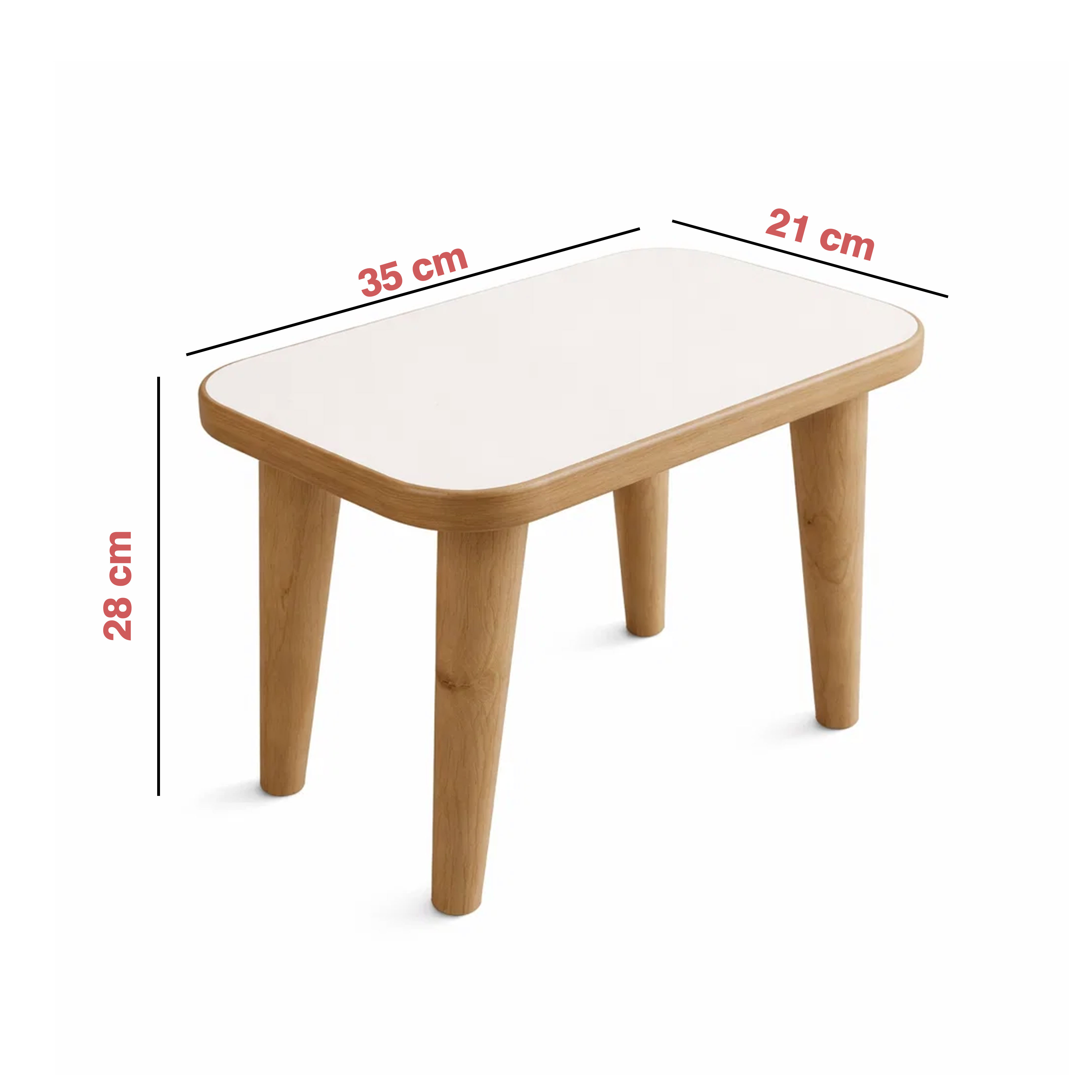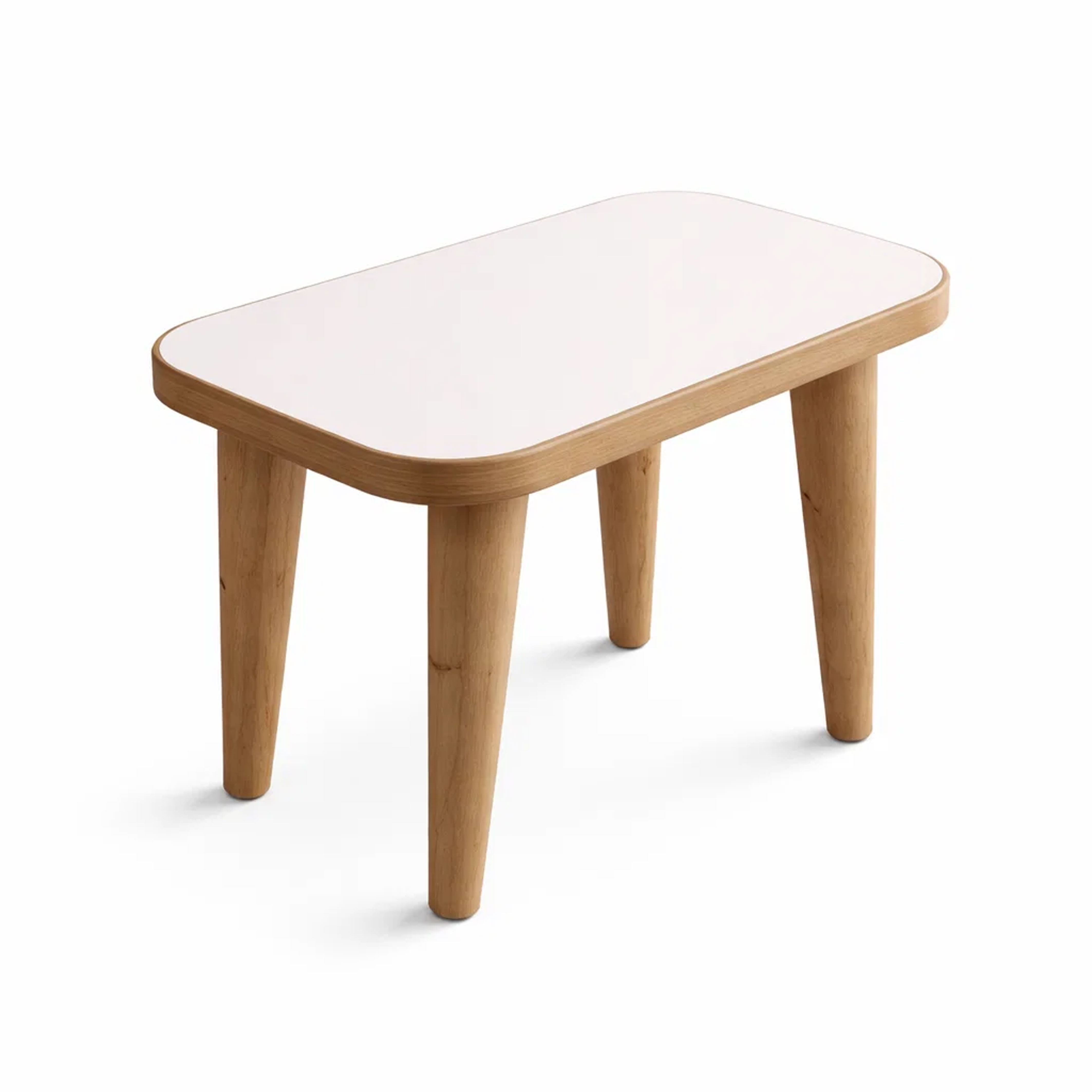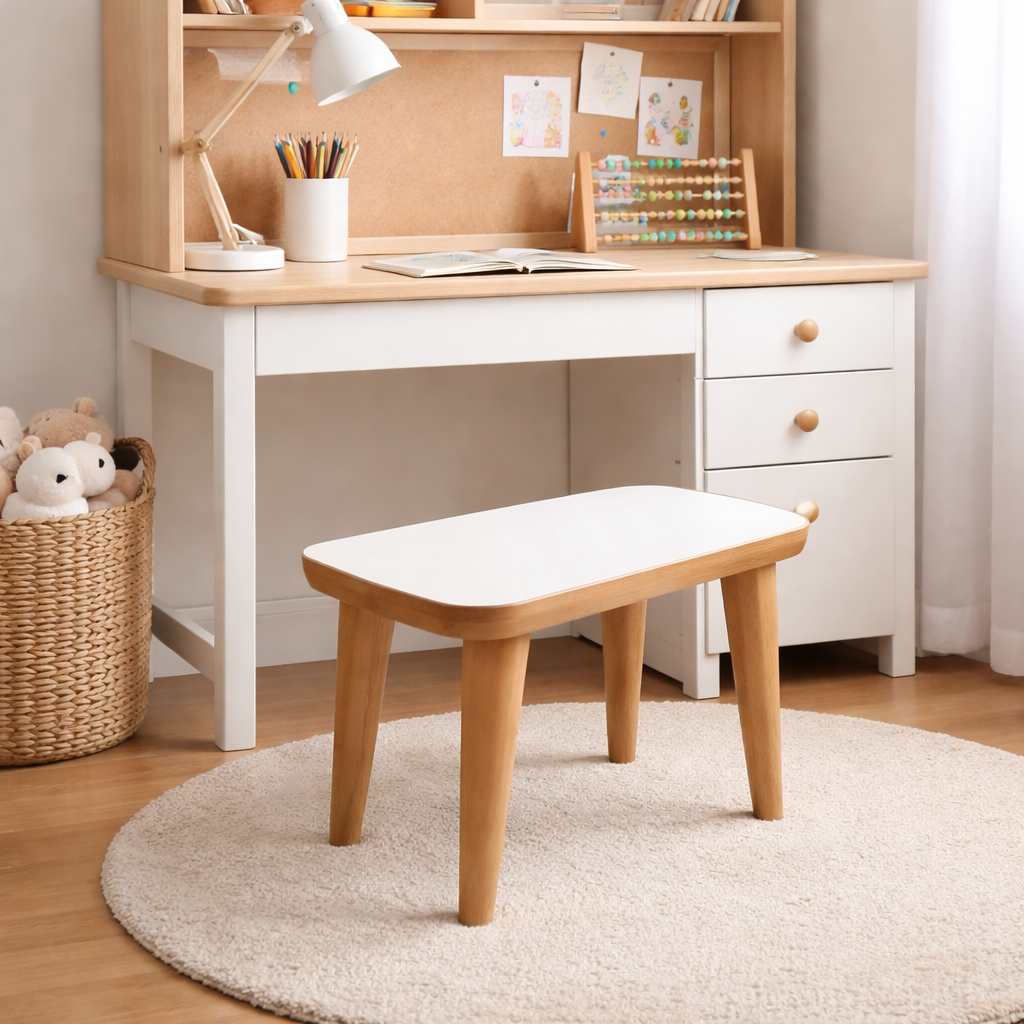 Die Sitzfläche besteht aus MDF in weißer Ausführung, während die vier stabilen Beine aus Holz gefertigt sind. Diese Kombination sorgt für eine moderne, freundliche Optik und gleichzeitig für eine stabile Konstruktion. Das schlichte Design fügt sich harmonisch in verschiedene Einrichtungsstile ein und passt gut zu vielen Kinderzimmermöbeln.