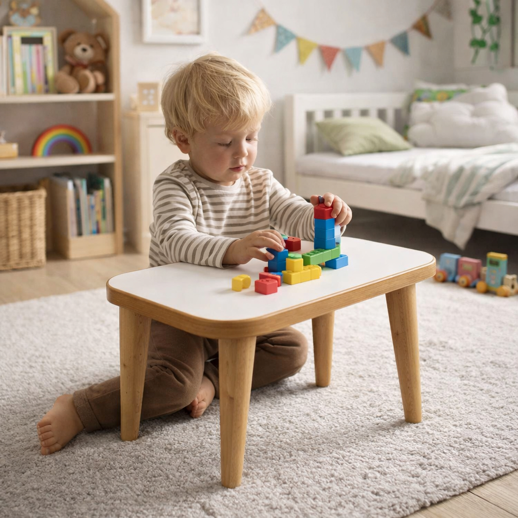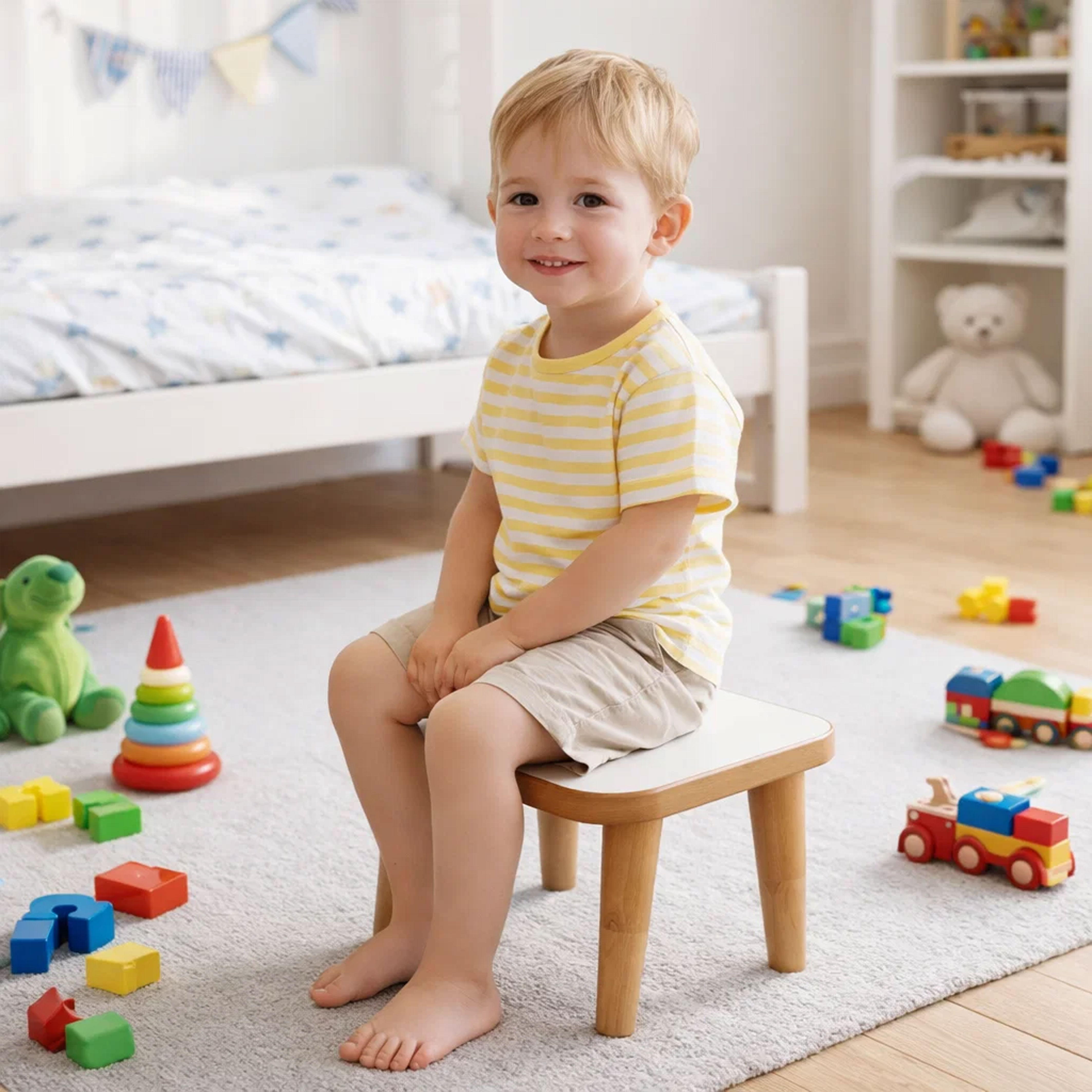 Der Hocker ist für den Innenbereich vorgesehen und eignet sich ideal für den täglichen Gebrauch im Kinderzimmer oder Spielbereich.