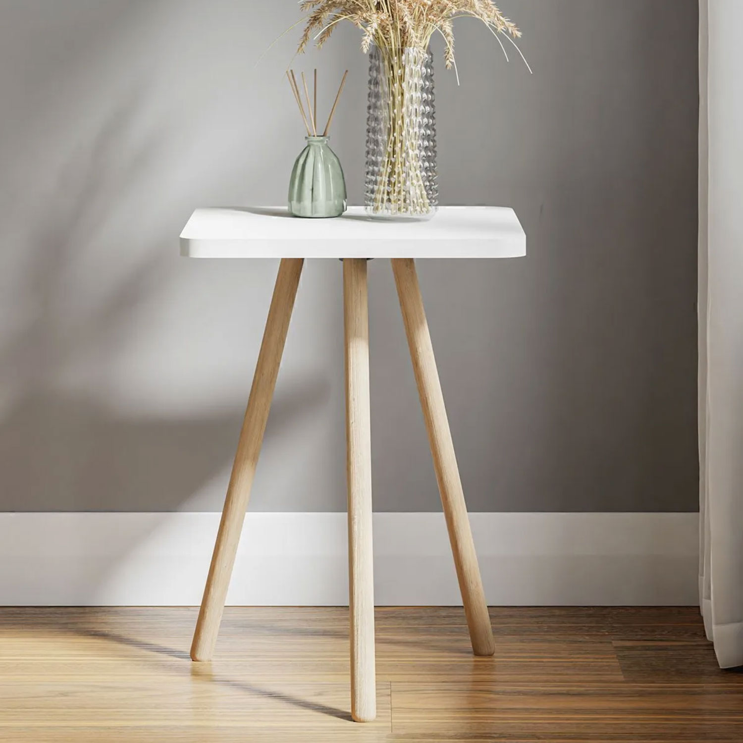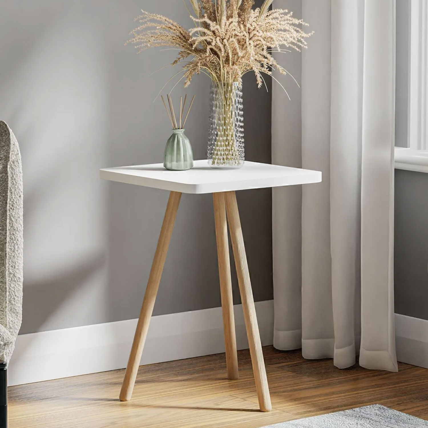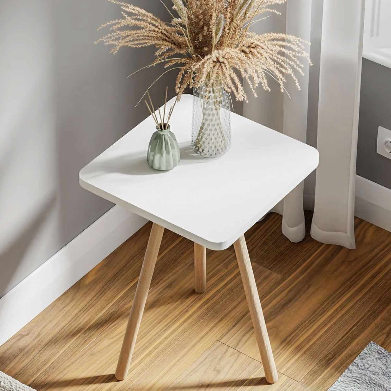 • Produktname: Quadratischer Beistelltisch mit Holzbeinen (Dreibein)
