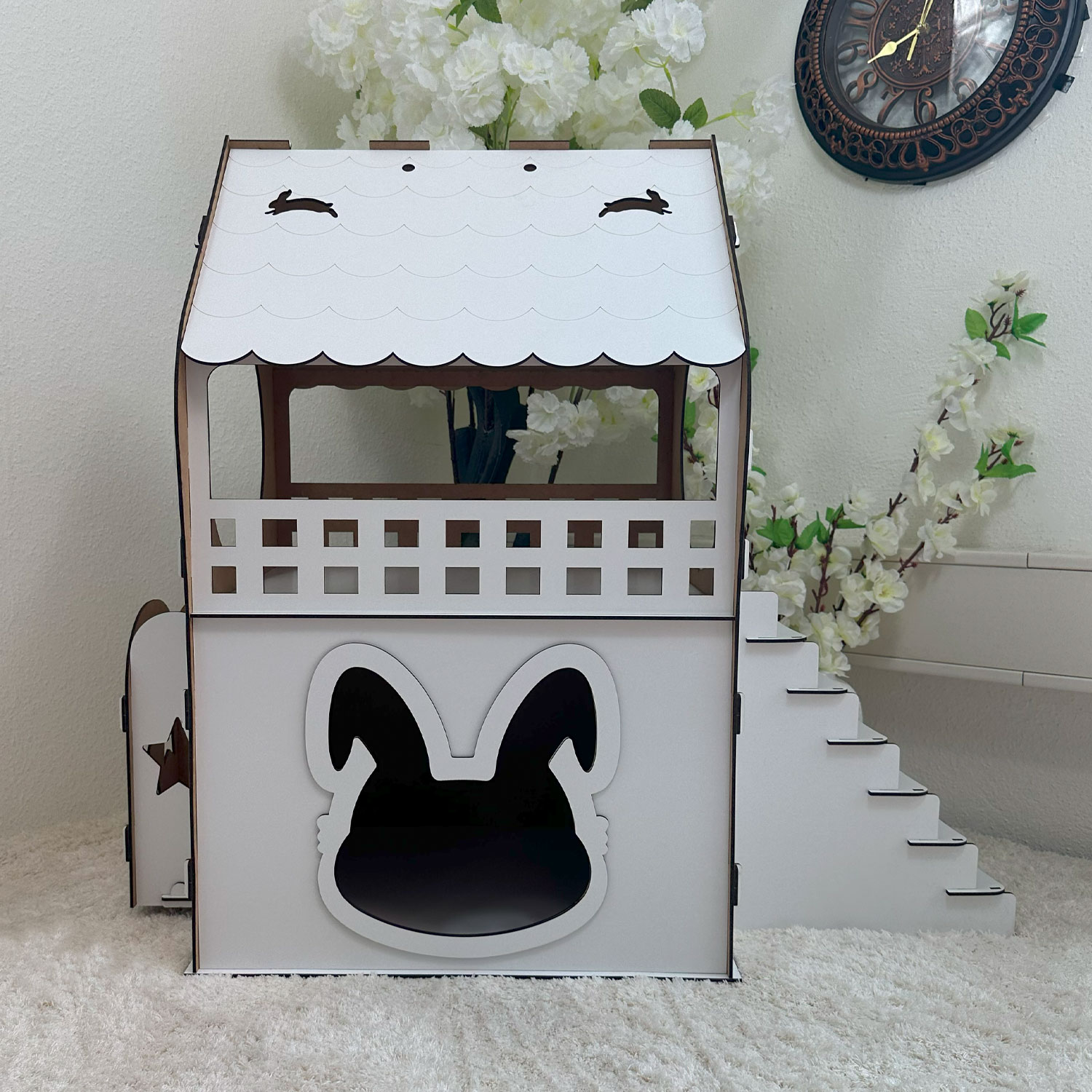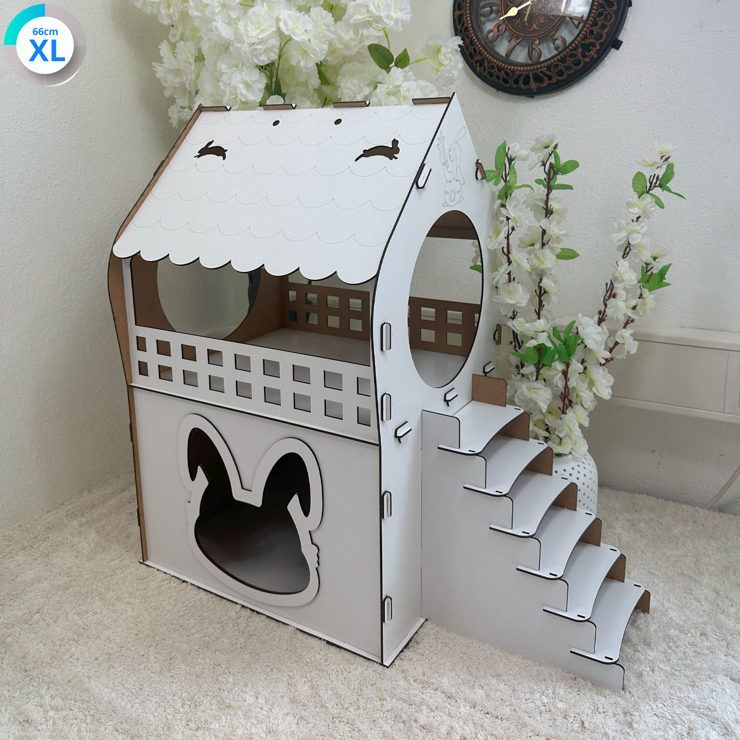 Das XL Hasenhaus ist ein funktionales und dekoratives Zuhause für Ihre Kaninchen oder kleinen Hasen. Mit zwei Etagen, einer integrierten Außentreppe und einer offenen Balkonfläche zum Liegen bietet es ausreichend Platz zum Spielen, Entspannen und Zurückziehen.