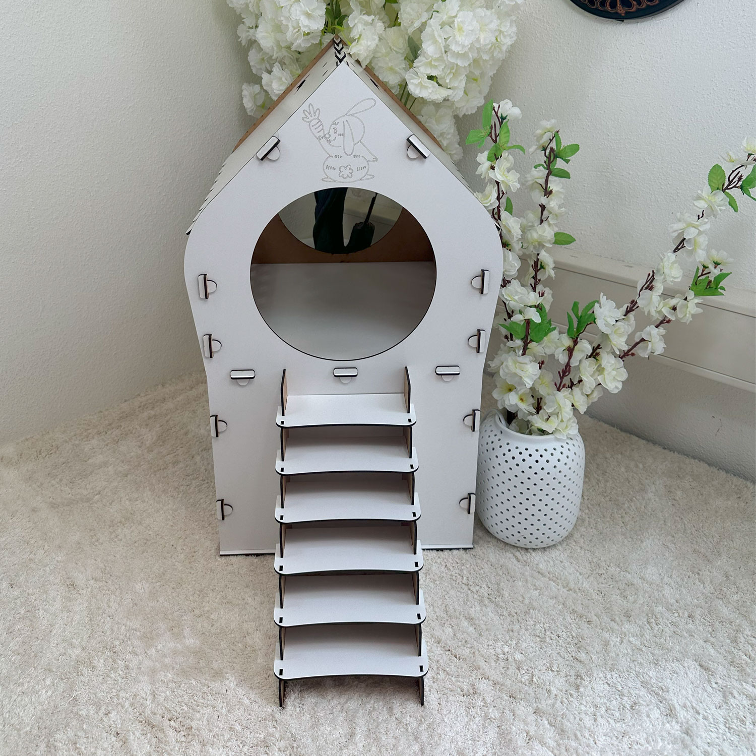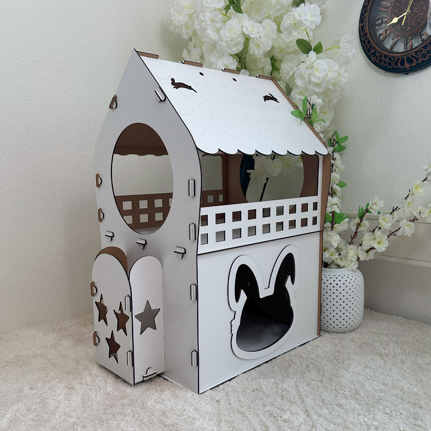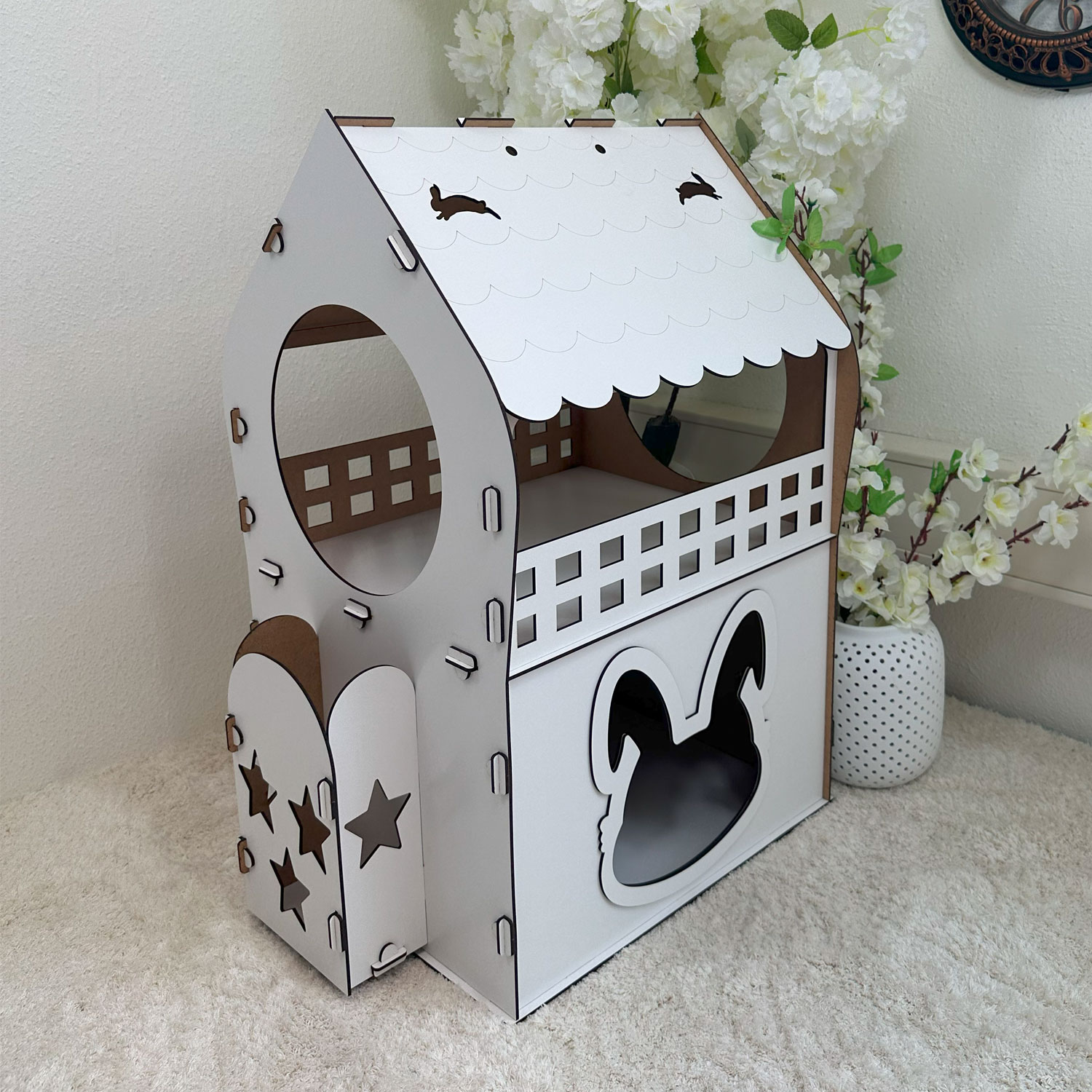 Dank seines praktischen Stecksystems ist das Häuschen in unter einer Minute aufgebaut – ganz ohne Werkzeug, Kleber oder Schrauben. Die durchdachte Konstruktion aus 3 mm starkem MDF sorgt für Stabilität, eine glatte Oberfläche und ein modernes Erscheinungsbild.