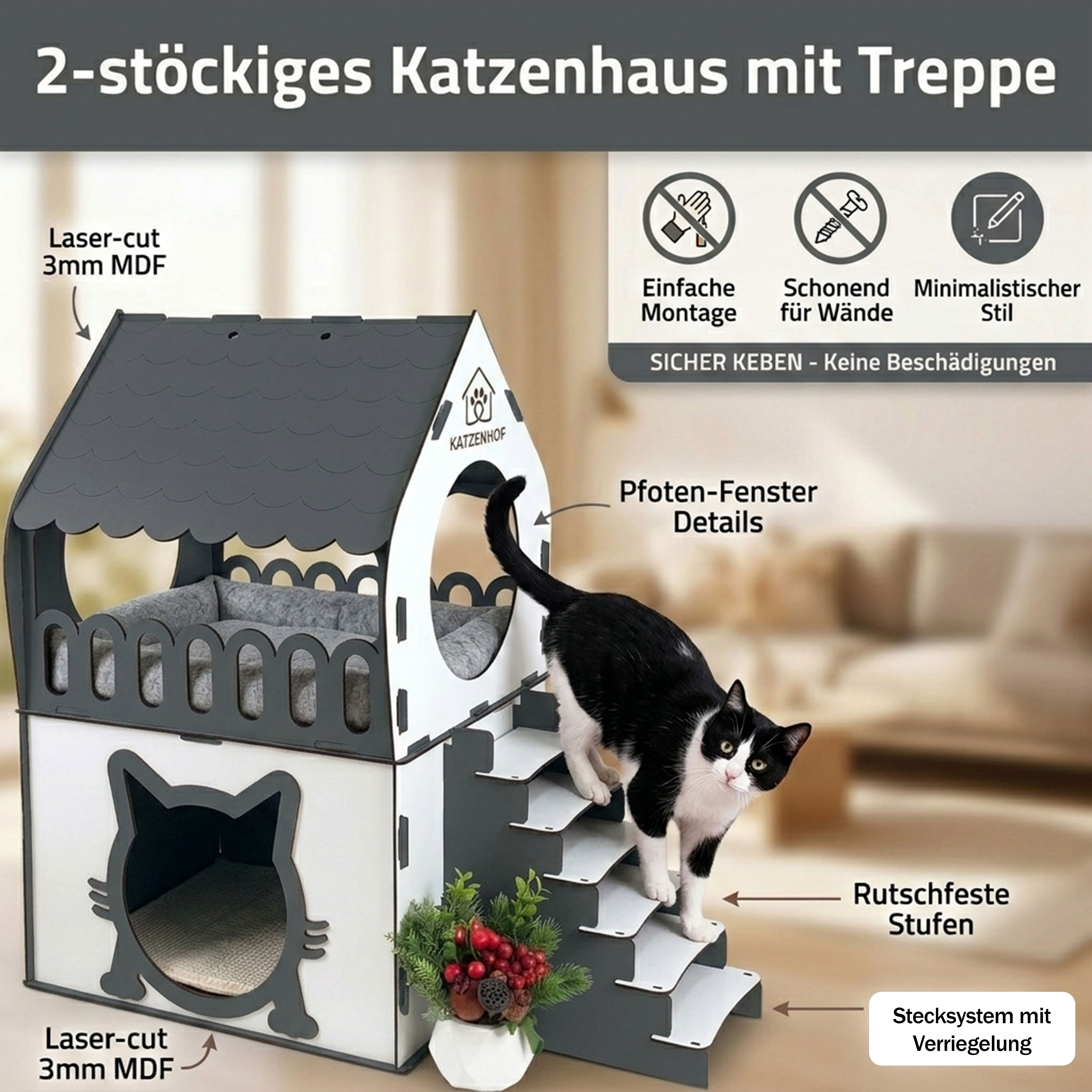 Das Katzenhaus fügt sich mühelos in jedes moderne Wohnambiente ein und sorgt für einen stilvollen Rückzugsort Ihrer Katze. Ob zum Dösen, Spielen oder Beobachten – mit seinem durchdachten Aufbau erfüllt es alle Bedürfnisse Ihrer Katze und lässt sich dabei im Handumdrehen zusammenbauen.