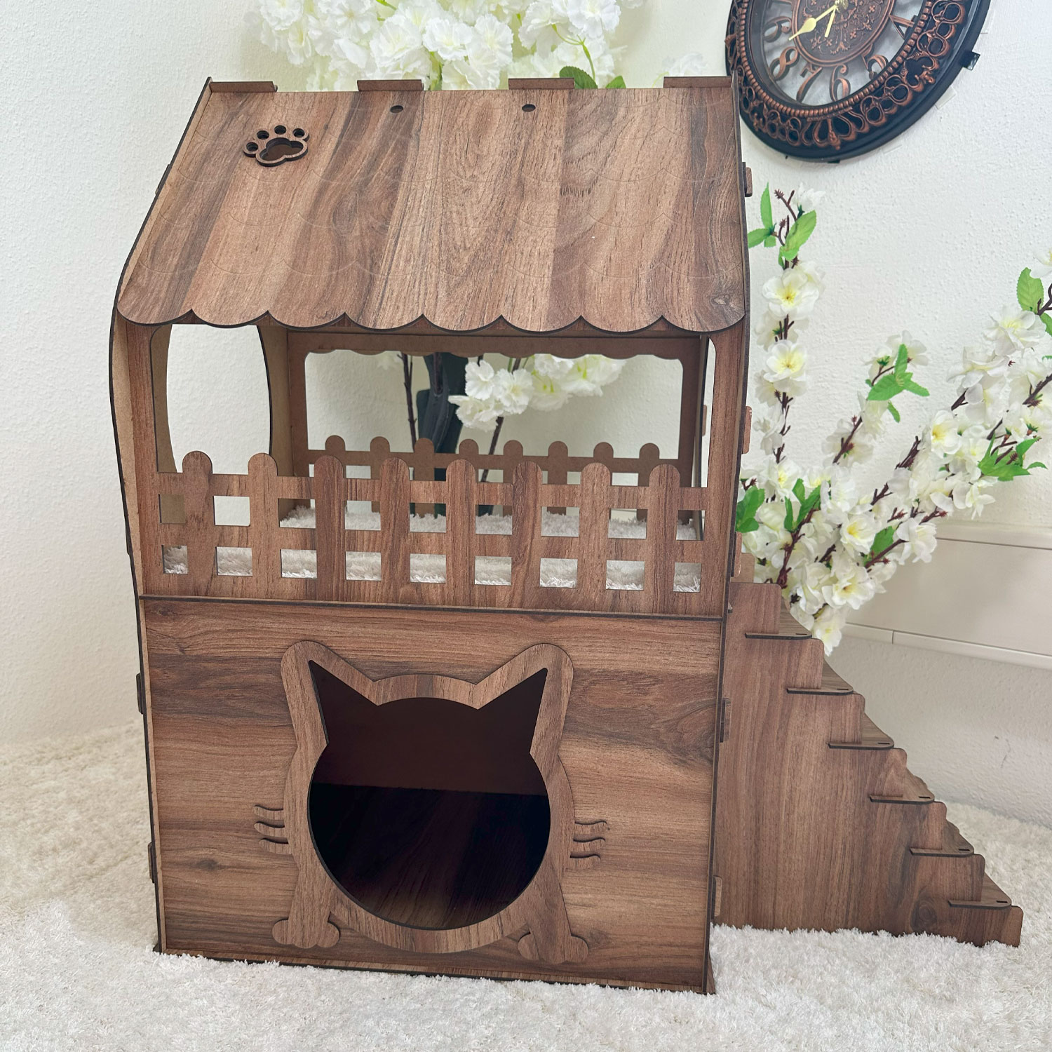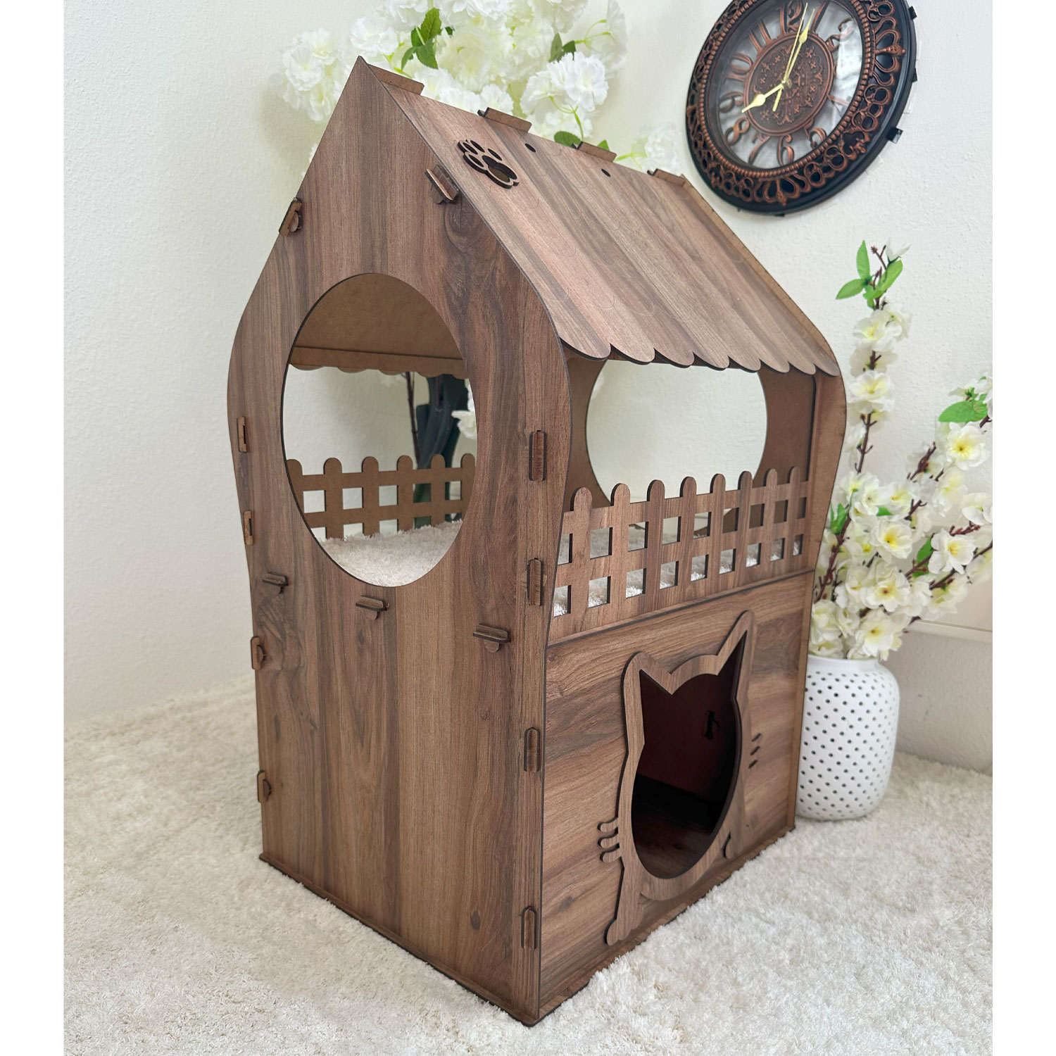 Design und Funktionalität stehen bei diesem Modell im Einklang: Die katzenförmige Eingangsöffnung, dekorative Rundfenster, ein fein gelasertes Dach mit strukturierter Oberfläche und der offene Balkon mit Geländer verleihen dem Katzenhaus nicht nur eine hochwertige Optik, sondern machen es auch zu einem echten Blickfang in jedem Wohnraum. Die vier verfügbaren Farbvarianten – Anthrazit, Marmoroptik, Braun und Dunkelbraun (Darkwood) – ermöglichen eine harmonische Integration in jede Einrichtung, von modern bis rustikal.