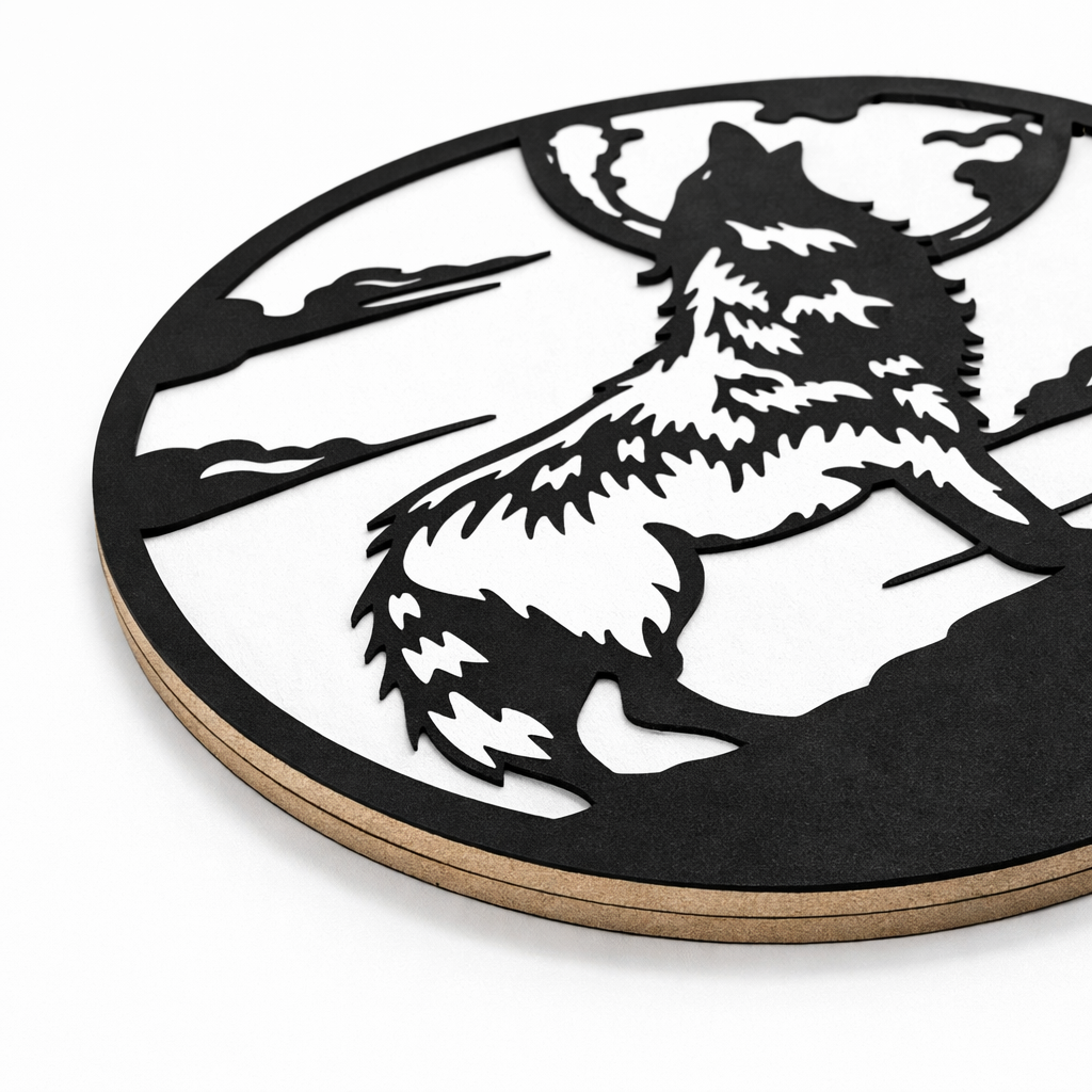 Das Wandobjekt wird präzise lasergeschnitten und überzeugt durch seine sauberen Kanten, die feinen Details im Fell sowie die markante Silhouette. Mit einer Materialstärke von 6 mm wirkt die Deko stabil, hochwertig und gleichzeitig angenehm leicht – ideal für verschiedenste Befestigungsarten.