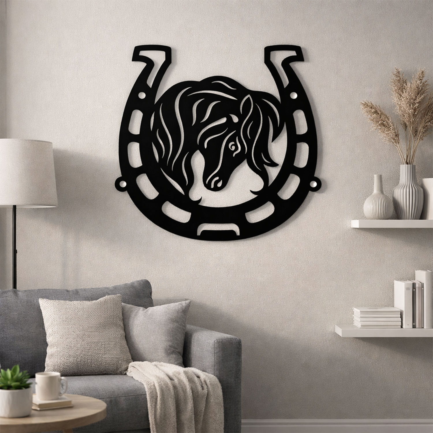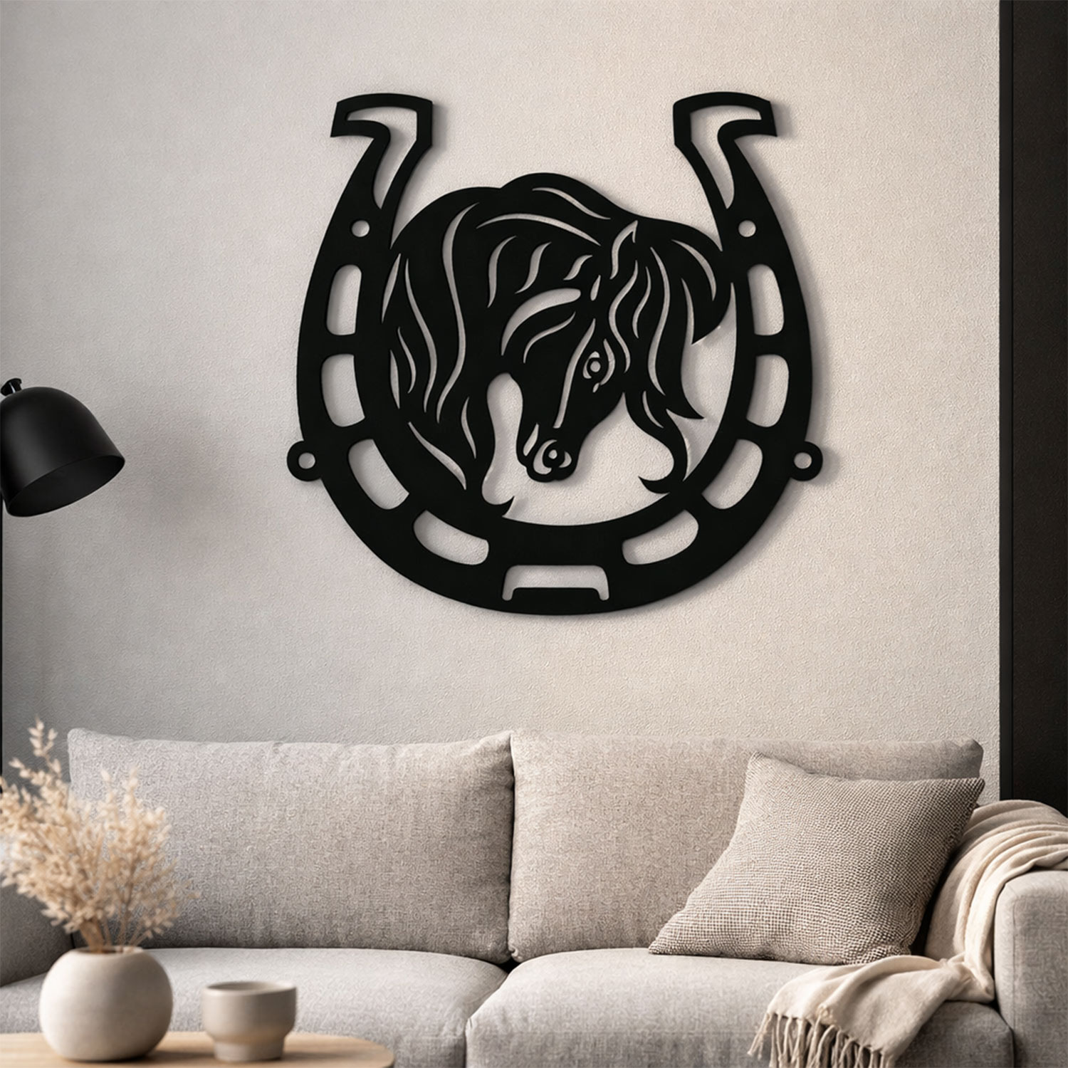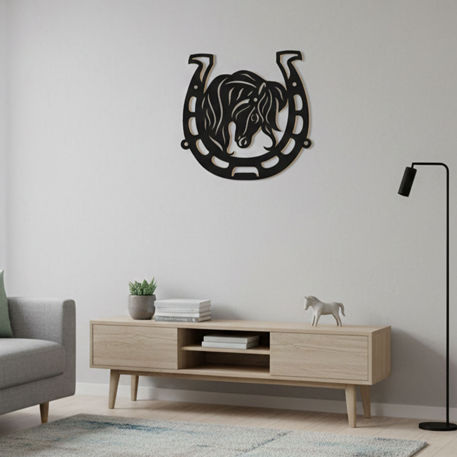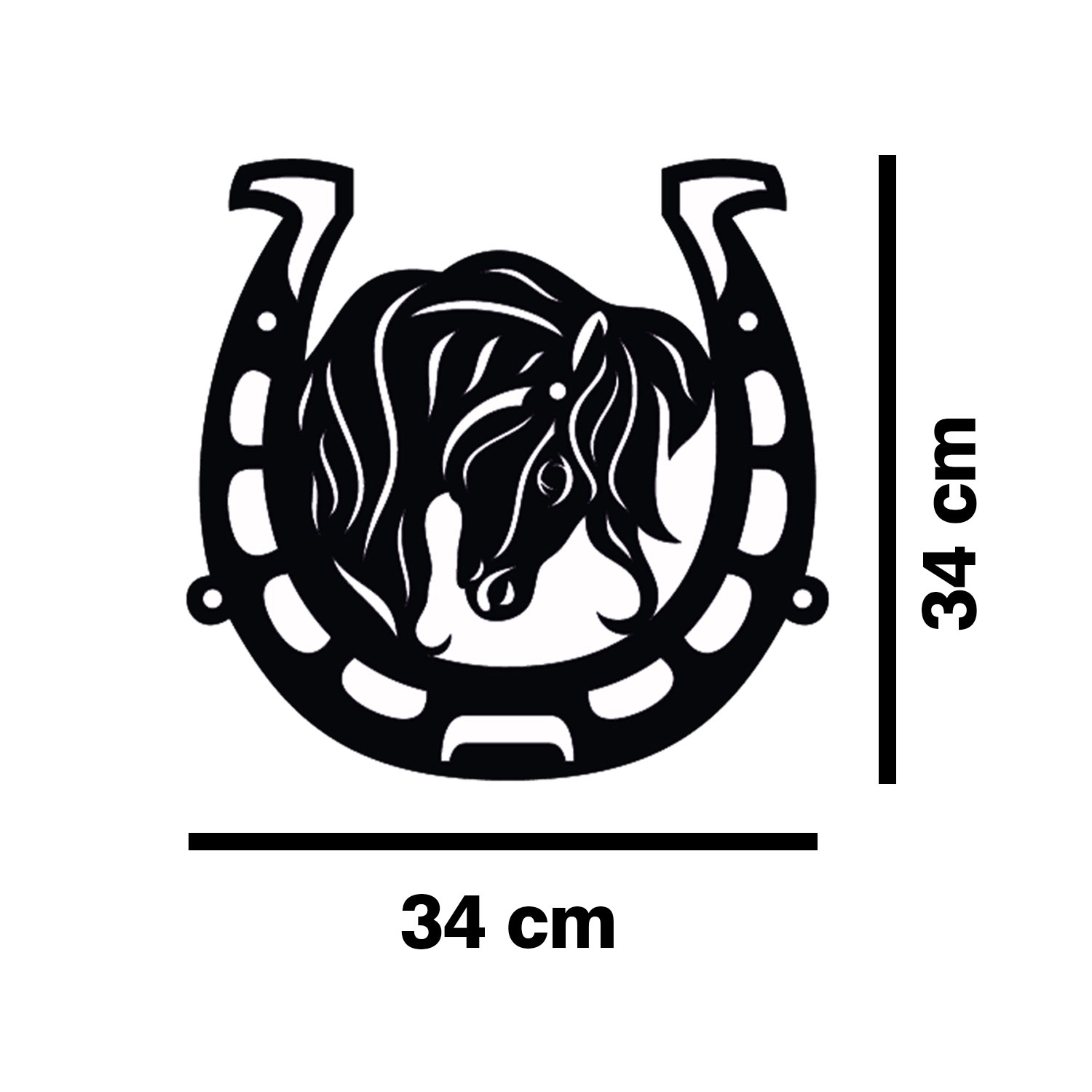 Dank der kompakten Maße (laut Abbildung ca. 34 × 34 cm) eignet sich das Pferde-Hufeisen-Motiv sowohl als einzelnes Dekoelement als auch in Kombination mit weiteren Wandobjekten. Auch an Türen, Fenstern oder Möbeln lässt sich die Dekoration stilvoll anbringen.